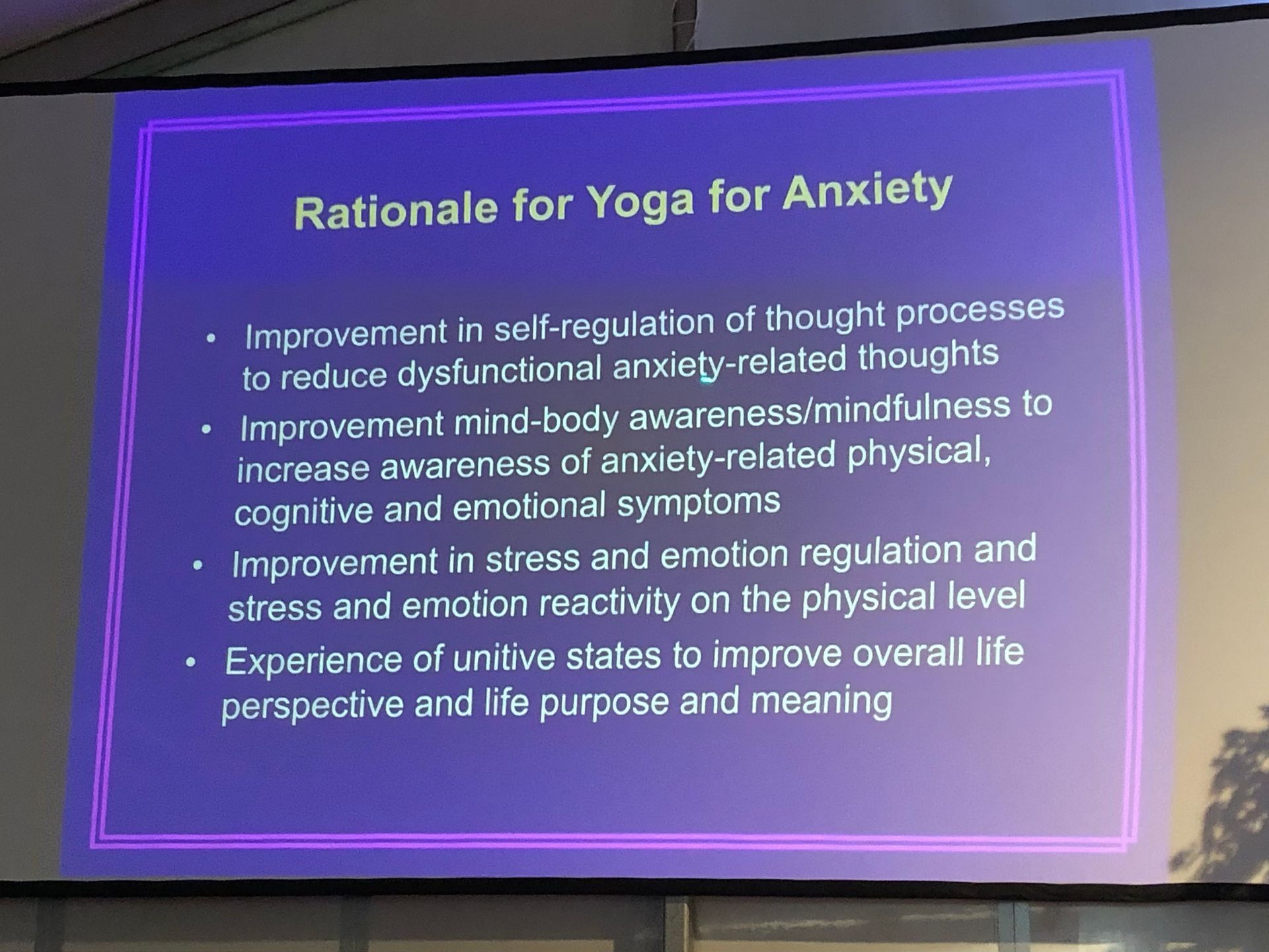 Yoga korrigiert die Selbstregulierung des Denkprozesses dadurch werden angstbezogene Gedanken reduziert. Yoga fördert die Körperwahrnehmung/Achtsamkeit. Dadurch können körperliche, kognitive und emotionale Angstsymptome schneller erkannt und unterschieden werden. Yoga verbessert die Stress- und Emotionsregulation, sowie die körperliche Fähigkeit, gelassener auf Stress und Emotionen zu reagieren. Yoga hilft, harmonische Zustände zu erfahren, die positiv auf die allgemeine Lebensperspektive und den Lebenssinn wirken. Auszug aus dem Vortrag beim Europäischen Yogafestival 2023 von Sat Bir Singh Khalsa, Ph.D. Er ist u.a. Forschungsdirektor des Kundalini Research Institute und forscht seit 2001 über Yoga.